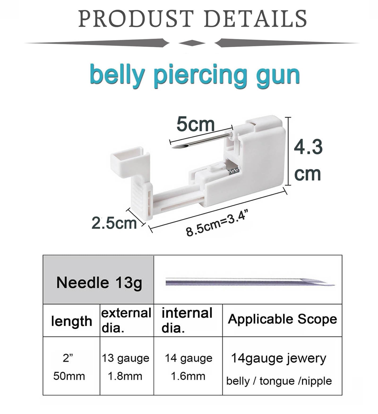 - Measurements - This belly piercing kit needle: 13g(1.8mm); Internal threaded belly button ring 14gauge (1.6mm), the belly rings bar length 3/8"(10mm), titanium belly ring top ball 5mm;