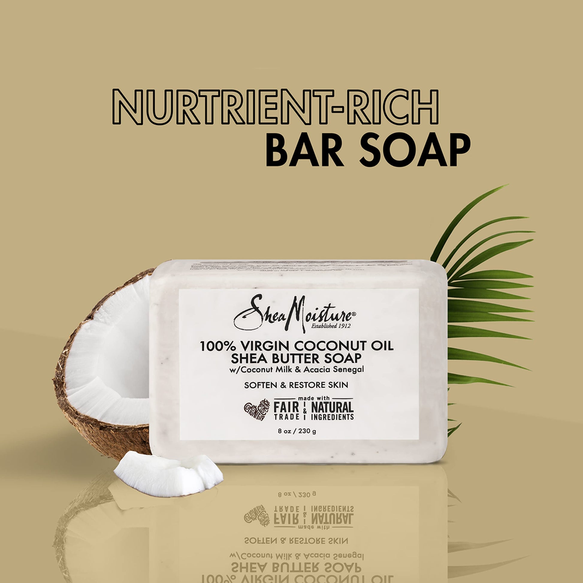 - SheaMoisture 100 percent Virgin Coconut Oil Hydration Bar Soap is a beauty bar body soap and gentle skin cleanser that will help soften and restore skin