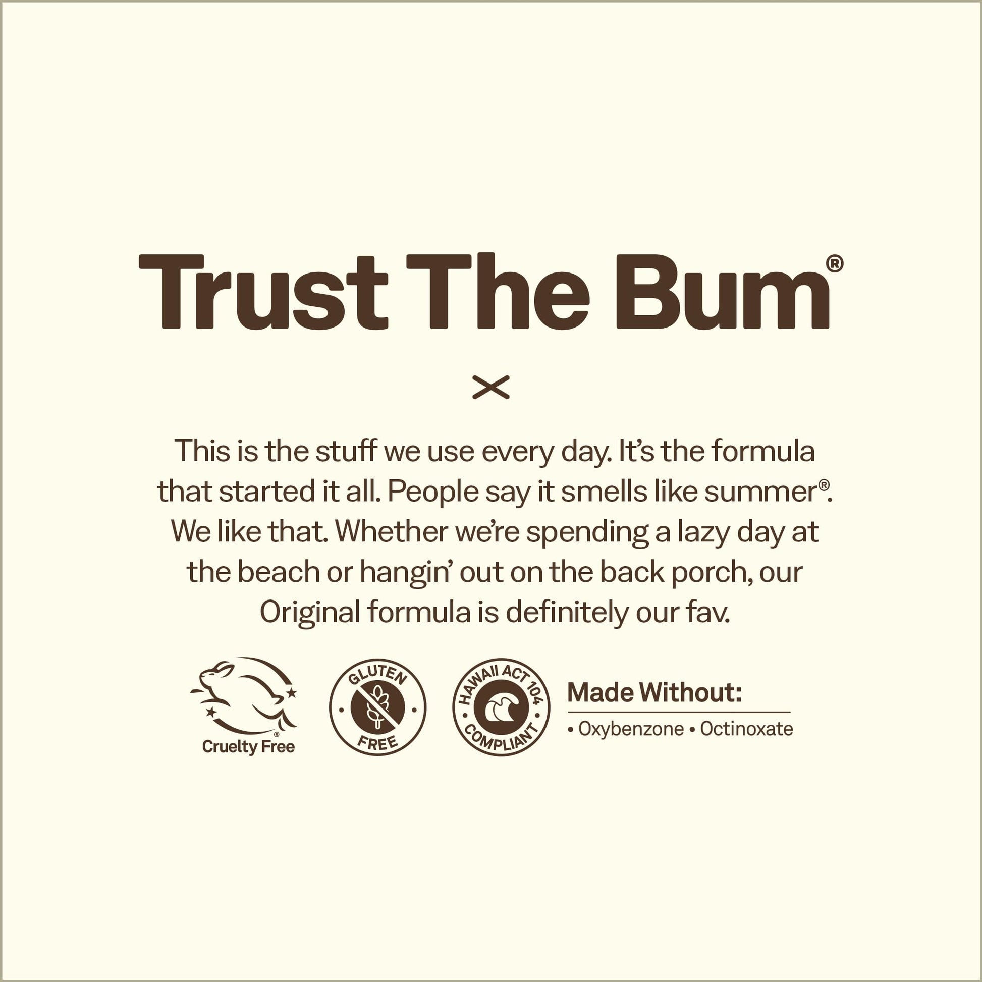 - TRUST THE BUM. What does that mean? It means trust us, the ones who live on the beach and need products that work on the most intense days in the sun. The simple truth is, when you make products to protect the ones you love, you make 'em better.