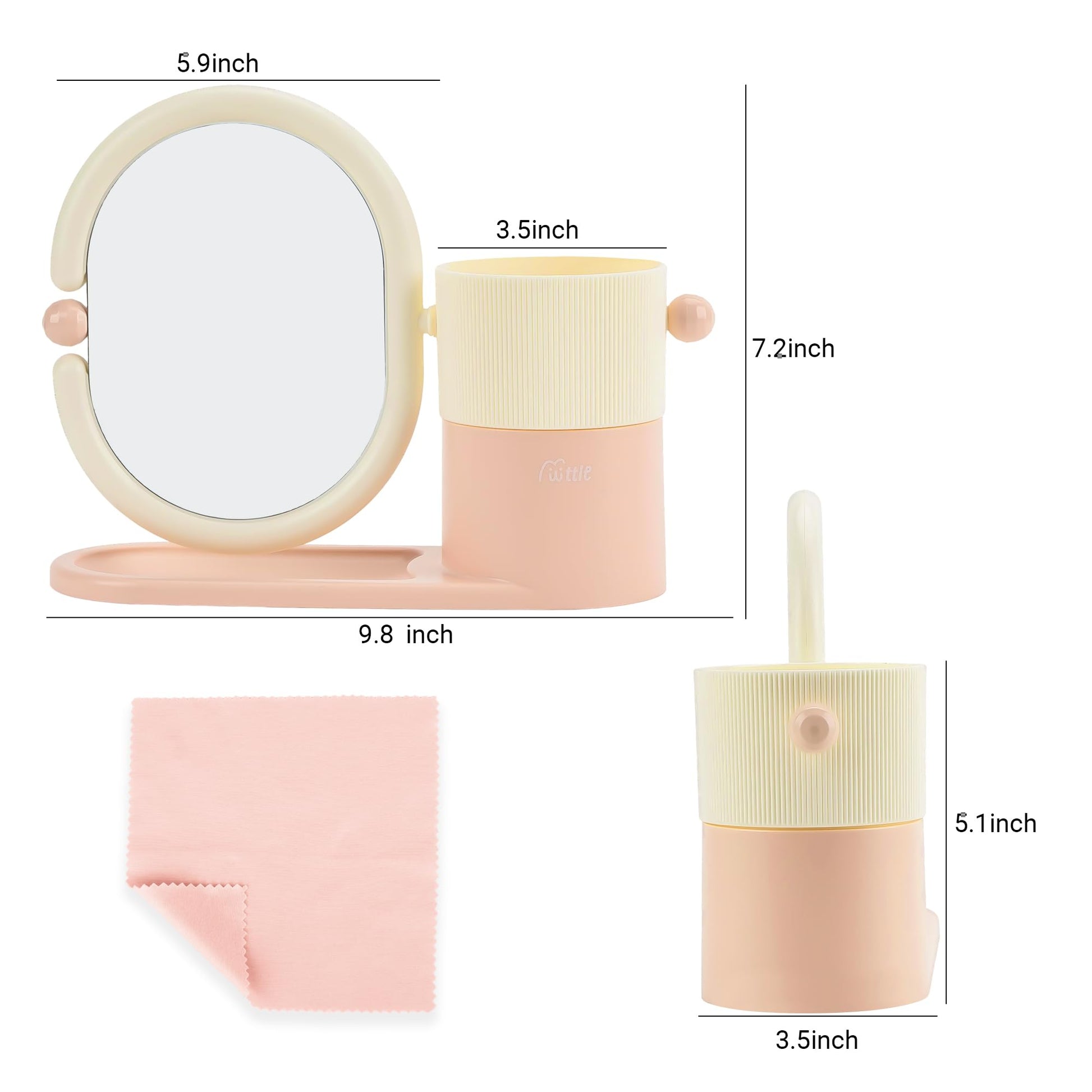 Umbrotiger Desk Organizer with Magnifying HD Rotating Glass Mirror 360° Adjustable Dual-Purpose Makeup Brush Holder Pen Caddy, Pink & White ABS Storage for Office & Vanity Accessories+Free Lens Cloth