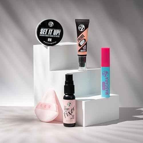 W7 On the Go Cuties Gift Set - Mini Makeup Essentials with Primer, Mascara, Setting Spray, Loose Powder & Powder Puff - Travel Size Beauty Favourites - Stocking Stuffer