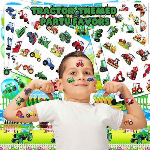96 PCS Tractor Farm Farmhouse Pre-Cut Temporary Tattoos for Kids | Super Cute Theme Birthday Party Favors, Supplies, Decorations, Green Red Fake Tattoo Stickers (Multiple)
