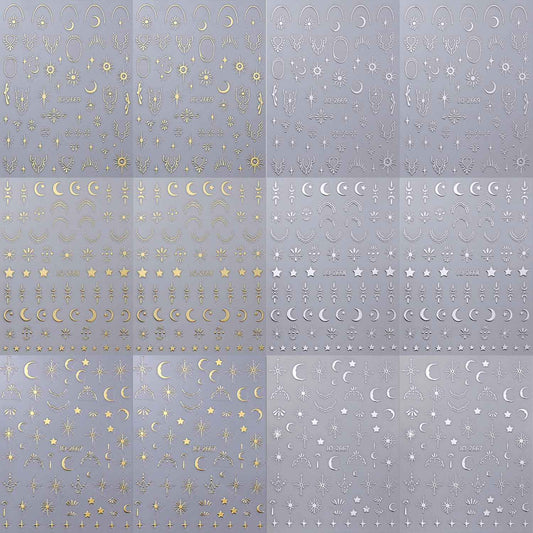 12 Sheets Silver Gold Moon Star Nail Art Stickers - 3D Self Adhesive Decals for Design and Decoration - Supplies Accessories for Women