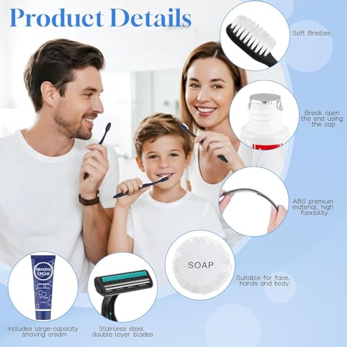 - What Will You Get: You will receive 40 set personal hygiene kits. Each kit includes 1pcs toothbrush, 0.6oz toothpaste, 1pcs comb, 0.53oz soap, 1pcs razor and 1 oz shaving cream. Individually sealed package provides the possibility for you to store them separately in many places.