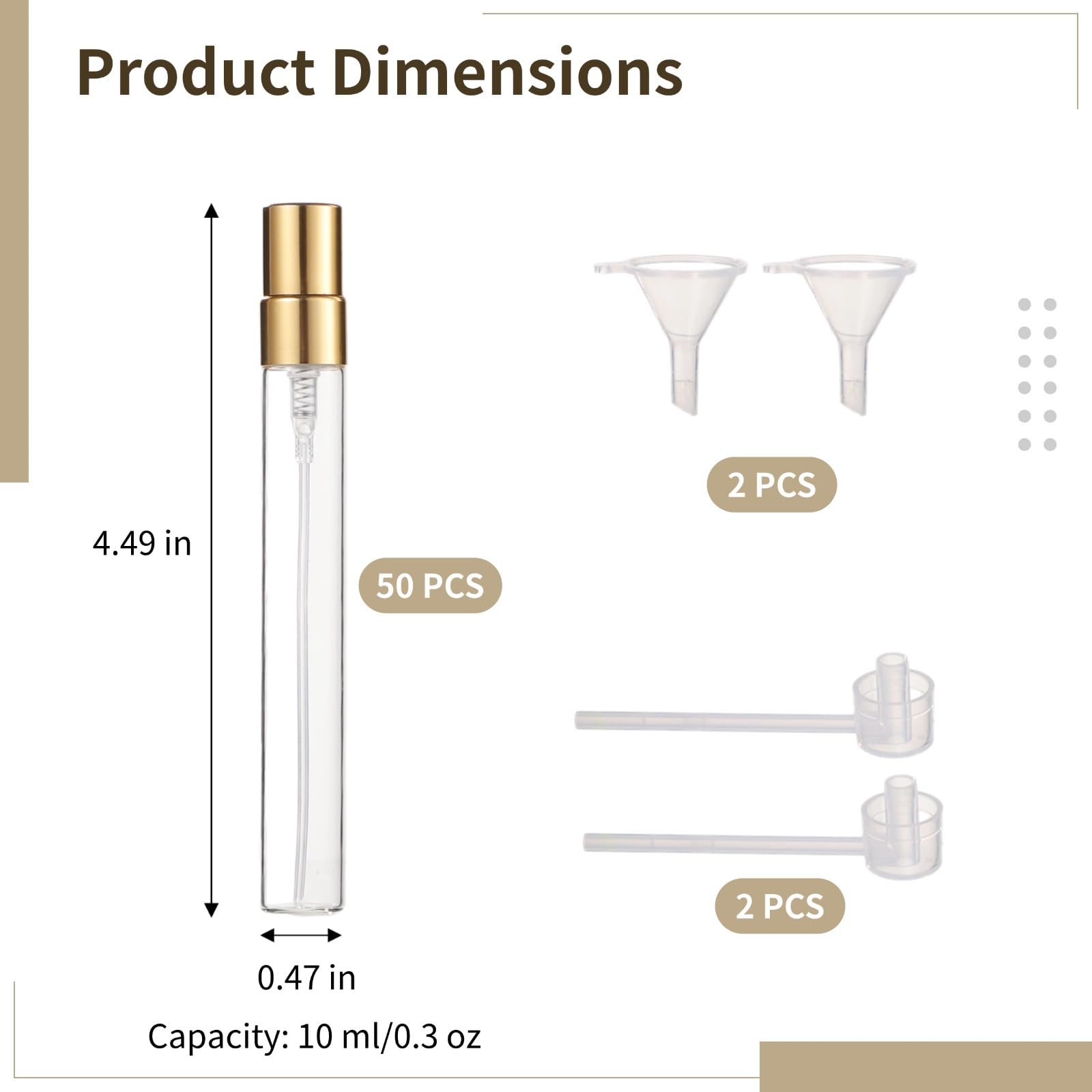 Lnrueg 50 Pcs 10 ml Perfume Bottles - Refillable Glass Mini Spray Bottles, Portable Travel Sample Containers, Fine Mist Atomizers with Caps, Includes 2 Funnels and 2 Dispensers, Ideal for Liquids