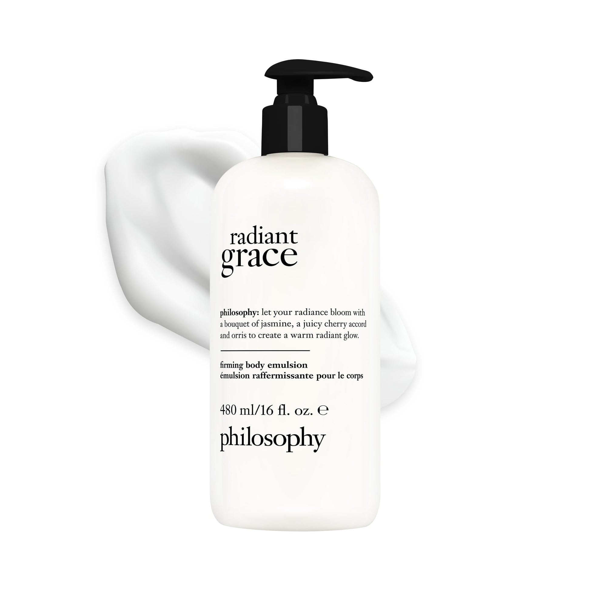 Details: share your radiant self with philosophy radiant grace firming body emulsion that smooths and provides long-lasting skin hydration, leaving you scented with a juicy black cherry accord, jasmine and caramelized sandalwood to create a warm, radiant glow.