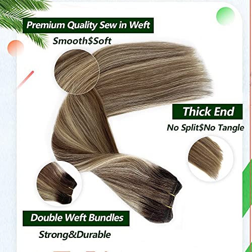 Weft Hair Extensions Human Hair, 16 inch 100g Ash Brown Highlighted Bleach Blonde Sew in Hair Extensions Real Human Hair Hand Tied Weft Hair Extensions Sew In Remy Hair Bundles Weave