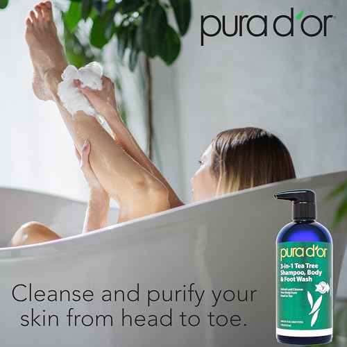 PURA D'OR 16 Oz 3-in-1 Tea Tree Shampoo, Body & Foot Wash, Shampoo - Total Body Care - Foot Odor & Daily Hygiene, Cleansing Routine, Post-Workout Refreshment - Soothes, Invigorates, Nourishes