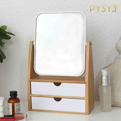 PYSYY 1x / 5X Magnifying Makeup Mirror, Jewelry and Cosmetics Storage Box with Double Drawers, Adjustable Natural Bamboo Stand, 360° rotatable Vertical Desktop Mirror (1, Rectangle)