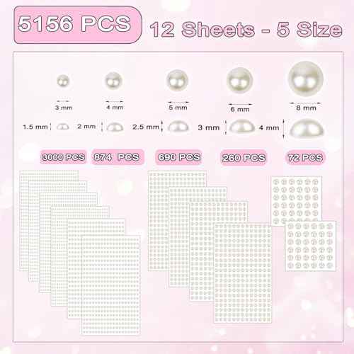 5156Pcs Hair Pearls, 3/4/5/6/8mm Self Adhesive Pearl Stickers for Crafting, White and Beige Flat Pearls Stick on Body Gems for Face Eye Nails Makeup and DIY Decorations Accessories, Assorted Sizes
