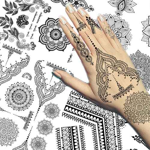 Vintage India Sexy Hands Temporary Tattoos For Women Finger Girls Adults, 4 Sheets Bohemia Lace Black Lotus Mandala Flower Fake Jewels Tattoo Sticker Kits Stencils, Party Favor Supplies Decoration