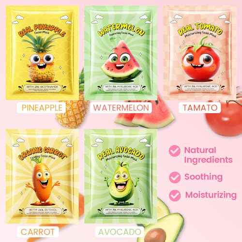 Kaely 10 Pack Fruit Face Masks for Kids, Kids Face Mask Spa Day Kit Supplies, Spa Party Favors for Teens Girls Women, Sheet Facial Mask Skincare Gifts Set, Moisturize Soothe for All Skin Types, 01