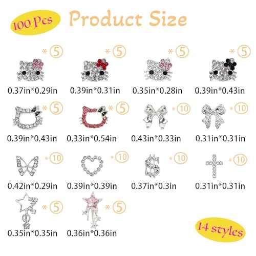 100 pcs 3D Sliver Nail Charms Y2K Cute Nail Charms Set with Kity, Butterfly, Bow, Star, Heart,Cross for Nail Art Decoration Y2K