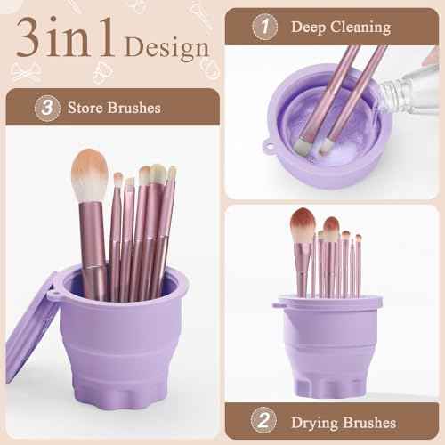 WantGor Makeup Brush Cleaner Mat with Brush Storage Holder, 3 in 1 Foldable Silicone Bowl Cosmetic Brushes Cleaning Pads Tool for Makeup Brush, Makeup Sponge, Powder Puff (Purple)