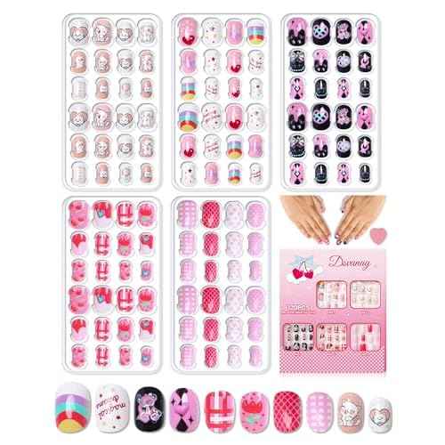120PCS 5 Pack Press on Nails for Kids,Tweens Girls Soft Fake Nail Kit, Reusable Creative Design kids Nails, Full Cover Glitter Stick on Nails Girl Nails for Kids Ages 8-12