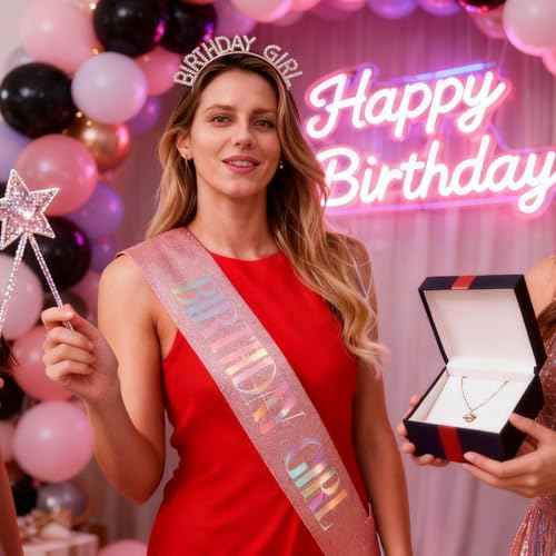 Rose Gold Birthday Girl Sash,Headband,Happy Birthday Banner,Hanging Swirl Decorations,Rhinestone Tiara Crown for Princess,Gift for Women.