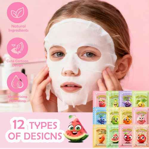 12 Pack Fruit Face Mask for Kids, Stocking Stuffers for Teen Girls, Skin Care for Kids, Christmas Gifts, Moisturizing Face Masks SkinCare, Face Masks Bulk, Slumber Party Supplies for Girls