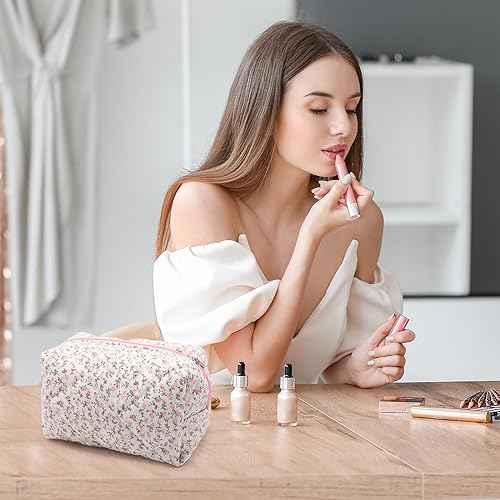 Cotton Quilted Makeup Bag, Cute Pouch Toiletry Bag Cosmetic Bag Quilted Floral Organizer Bag Travel Coquette Aesthetic Portable Storage Zipper Purse for Women (Pink)