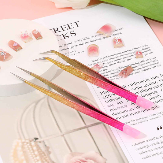 Double Ended Nail Art TweezersCurved,2Pcs Tweezers, Eyelash Tweezers, Straight Fine Tip Tweezers for Women with Silicone Pressing Tips, Suitable for Nail Art, Hair Removal, Jewelry