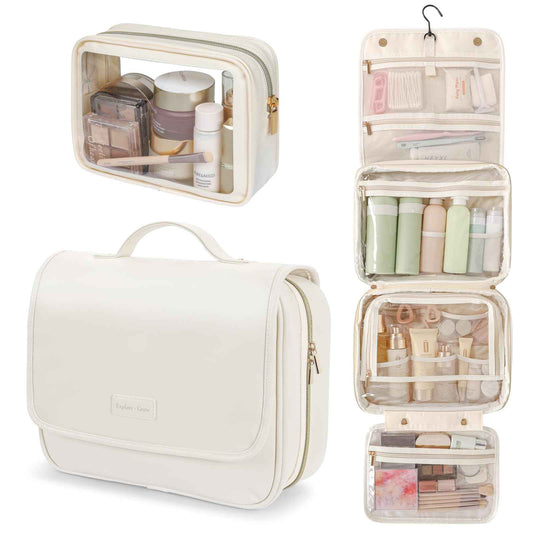 PACKISM Hanging Travel Bag for Traveling with Clear Makeup Bag - Soft Leather Waterproof Travel Toiletry Bag for Full-Sized Toiletries and TSA Approved Toiletry Bag, Off White (L)