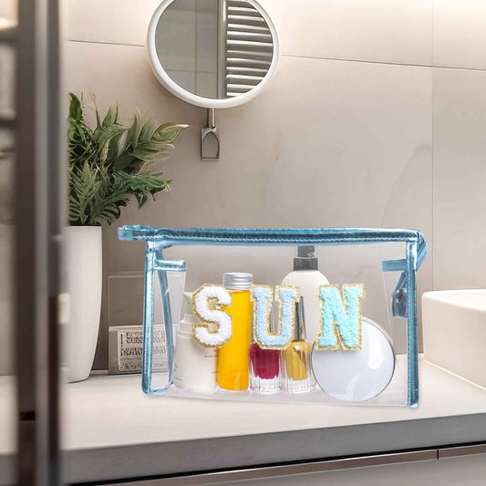 Hmxpls Clear Preppy Patch Makeup Bag, Sun Chenille Letter Bag for Beach, Pouch With Zipper, Travel Cosmetic Toiletry Bag for Women Girls Teens (Blue)