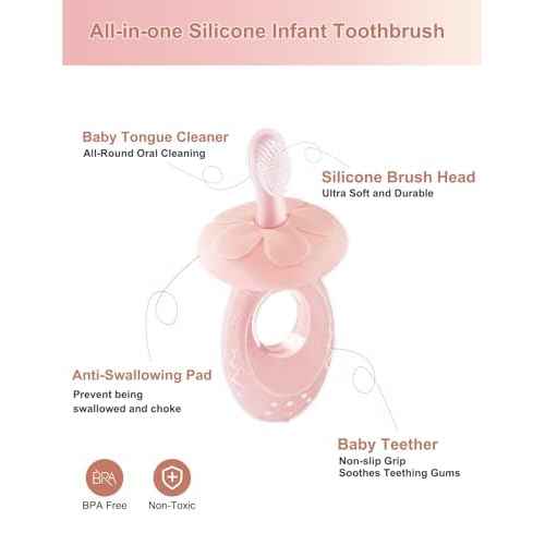 Baby Toothbrush & Teether for Infant and Toddler, Silicone Baby Oral and Tongue Cleaner, Ultra Soft Infant Training Toothbrush with Travel Case, Adjustable Safety Shield - Pink