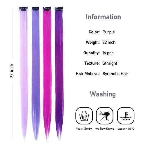 16Pcs Purple Colored Clip in Hair Extension Multi-colors Party Highlights Clip on Synthetic Hairpiece Halloween Cosplay Party Christmas Gift for Women Kids Girls 20inch (MIX Purple)