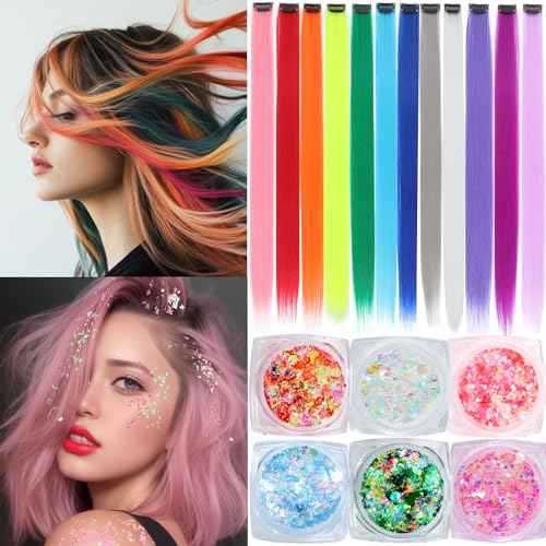 Colored Hair Extensions, 22 Inch Straight Clip in Hair Extension Body Face Hair Glitter Multi Color Rainbow Pink Red Hairpiece Extensions for Kids Girls Women (Glitter+12 color)