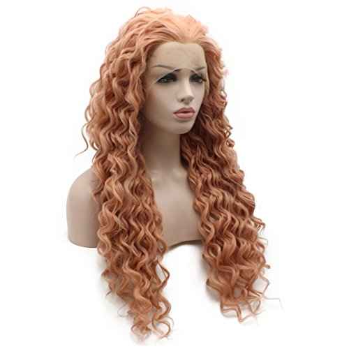 iwonawig Iewig Rose Golden Pink Front Lace Wig Long Curly Synthetic Lace Front Heat Friendly Fiber Half Hand Tied