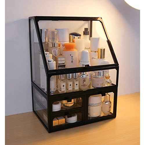 MOOCHI Black Vintage Glass Cosmetic Makeup Organizer 3 Drawers Set Dust Waterproof Cosmetics Storage Display Case Countertop for Brushes Lipsticks Jewelry