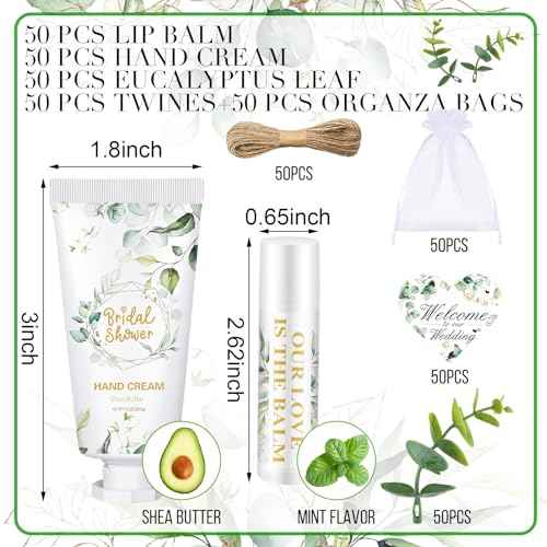 50 Set Bridal Shower Favors Bulk Wedding Gifts for Guests Include Lip Balm Wedding Hand Cream Bag and Tag for Bridal Shower Bachelorette Party Decoration(Eucalyptus)