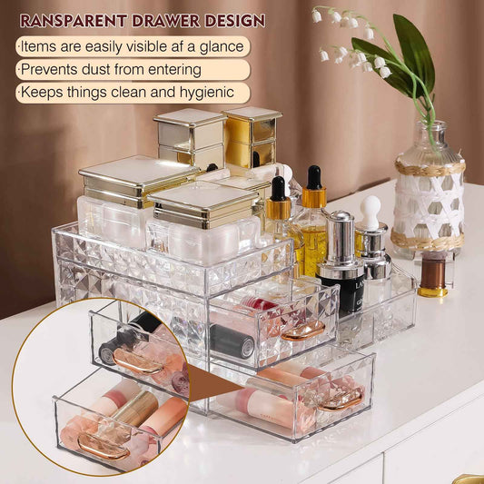 Clear Makeup Organizer for Vanity,Desk Makeup Caddy With Drawers for Cosmetics,Lipsticks Nail Care Skincare Jewelry Countertop Organizers,Cosmetic Display Cases for Bathroom, Dresser (Clear)