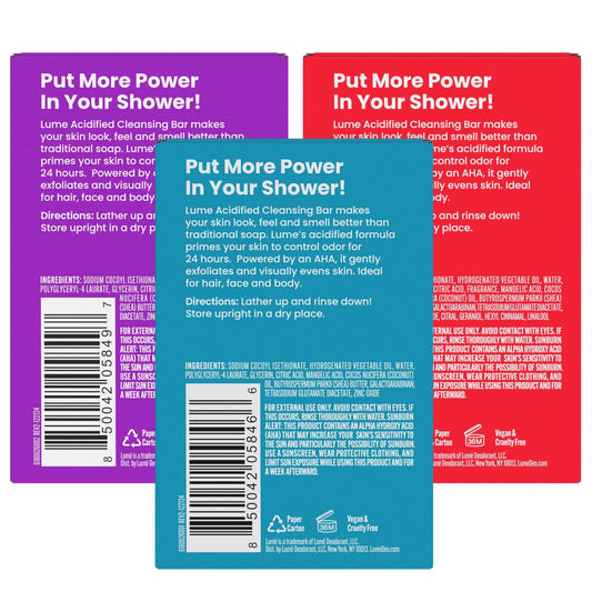Lume Acidified Body Cleansing Bar - 24 Hour Odor Control - Removes Odor Better Than Soap - Moisturizing - No SLS or Parabens - OB/GYN Developed - 8.5 Ounce, 3 Pack (Tangerine, Lavender, & Unscented)