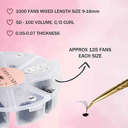 Promade Eyelash Fans Mix Length 1000 Volume Lash Extensions 8D-16D, C D Curl, 9-16mm Length, 0.05-0.07 Short Stem Promade Premade Pre Pro Loose Fans Eyelash Extension, Easy Application