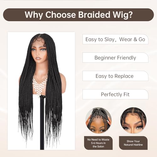 Box Braided Wig Full Double Lace Glueless Braids Wig with Baby Hair Human Hair Blended Synthetic Black Braided Wig for Black Women (1B, 30 Inch)