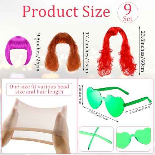 27 Pieces Colored Wigs Funky Neon Colorful Wigs with Heart Shape Sunglasses and Wig Cap for Women Cosplay