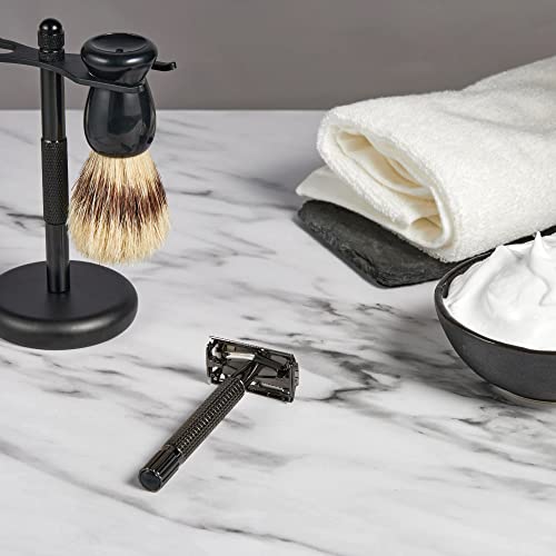 Deluxe Men¡¯s Wet shaving Kit, All Black Set, Lengthen Version Double Edge Safety Razor, Large Stand, Shaving Brush, Ceramic Shaving Bowl and 10 Extra Blades