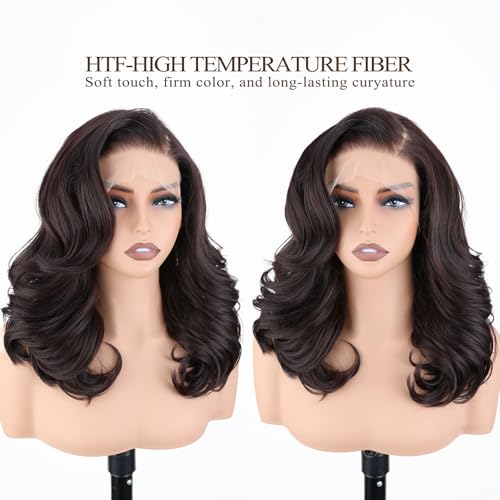 SISgrace Brown 13¡¿6 HD Lace Front Wigs Synthetic Glueless Pre Layered Brown Roots Body Wave Wigs for Women Pre Plucked 18 Inch Tiny Knots Lace Natural Hairline Bob Wig