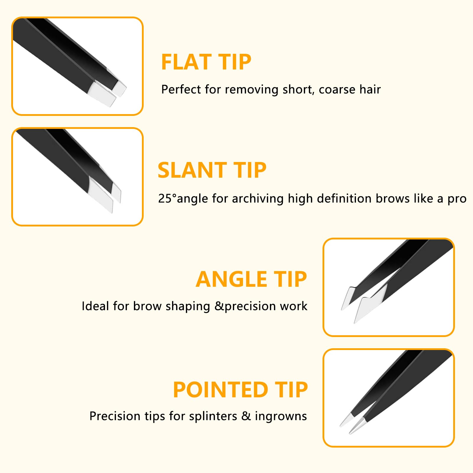 - 【Precise and Controlled】: Our eyebrow tweezers are expertly slanted for a secure grip and precise tweezing control. The tips of the tweezers are perfectly aligned for accuracy.