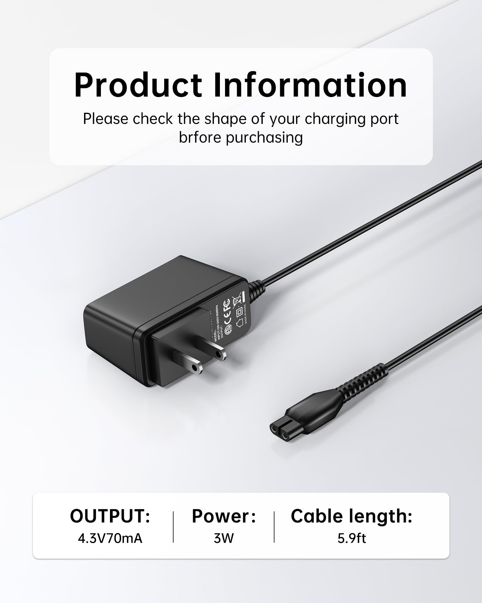 - Power Specifications: Replacement for OneBlade Charger Specification :Input: 100-240V AC, 50-60Hz, Output: 4.3V70mA ;Cable length: 5ft