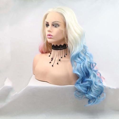 Xiweiya Wig 60# Platinum Blonde Ombre Blue Mixed Pink Lace Front Wig Long Body Wavy 3 Tones Synthetic Lace Front Wig Heat Resistant Fiber Wig for Woman Halloween Harley Quinn Cosplay 24inch