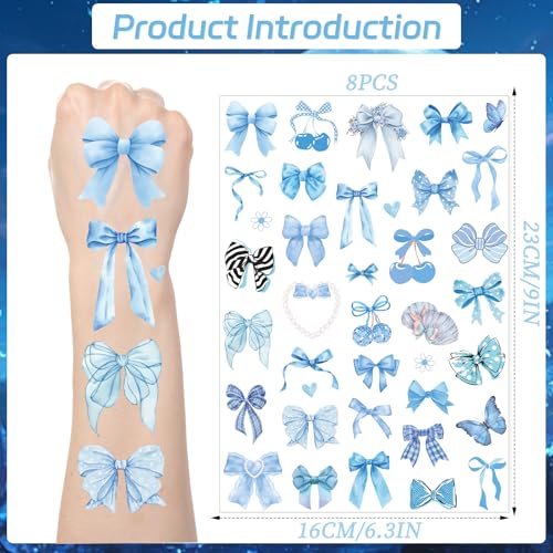 Blue Bow Temporary Tattoos - 200+ Blue Coquete Birthday Decorations Bow Themed Party Favors Ribbon Tattoo Stickers Gifts Wedding Birthday Bridal Shower Supplies Prizes Rewards for Girl Women