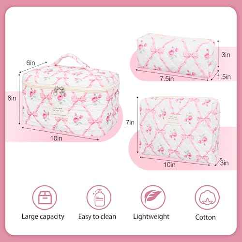 Quilted Makeup Bag,Large Cosmetics Bag Set,Cotton Coquette Floral Make up Pouch,Travel Toiletry Bag for Women