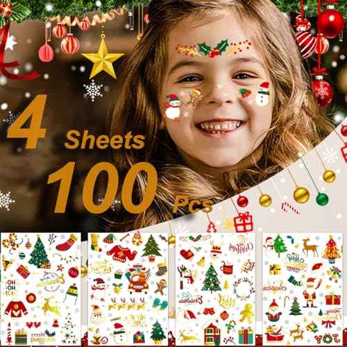 Christmas Party Favors for Kids - 100PCS/4 Sheets Christmas Temporary Tattoos Decorations Party Favors Accessories Goodie Bags Stocking Stuffers Xmas Santa Claus Reindeer Snowman for Kids|6 x 8.2 inch