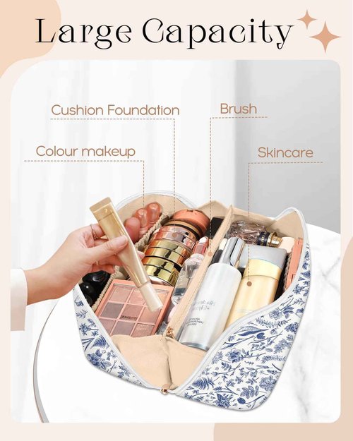 Bistup Makeup Bag Travel Cosmetic Bag Toiletry Make Up Bags Cute Women Large Capacity Big Medium Leather Blue Floral Aesthetic Girl Teen Teenage Foldable Expandable Open Flat Zip