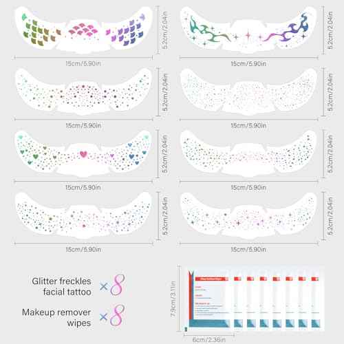 Holographic Glitter Freckles Face Tattoo 8 Pcs Waterproof Temporary Face Sparkle Patches for Women, Face Glitter Makeup Freckles Mix of Mermaid Scales Hearts Speckles Stars Dots, Cool Party Supplies