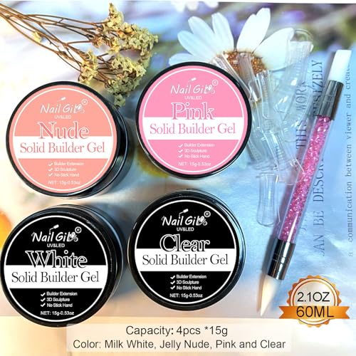 NAILGIL Solid Builder Gel For Nails 4 Colors, White Clear Nude Pink 3D Flower Nail Art Sculpture Extension Gel Non-Sticky Hand Sock Off UV LED Salon DIY at Home-60g/2.1oz