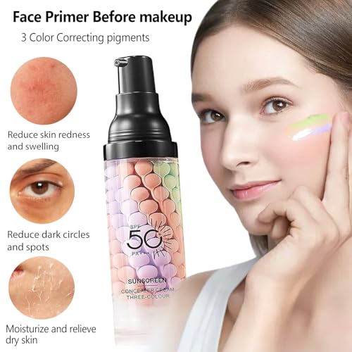 Firstfly Color Correcting Makeup Primer with SPF 50, Sunscreen 3 In 1 Moisturizer Isolation Cream, One Step Skin Tone Corrector for Dark Circles & Fine Lines, Makeup Brush Include