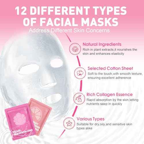 12 Pack Collagen Hydrating Face Masks Skincare, Sheet Face Mask for All Skin Types, Facial Masks Set for Women Skin Care, Face Mask Bulk Spa Gifts for Women