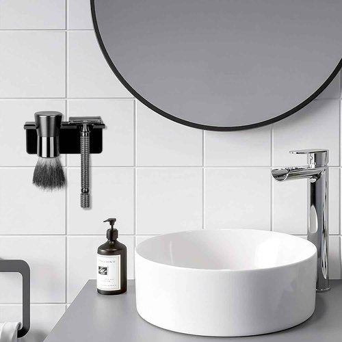 LUEXBOX 2 Pack Safety Razor Holder for Shower Wall, Self Adhesive Razor and Brush Stand for Bathroom, Shaving Brush Stand Compatible with Fusion 5 Proglide, Mach 3 Classic(Black Clear)